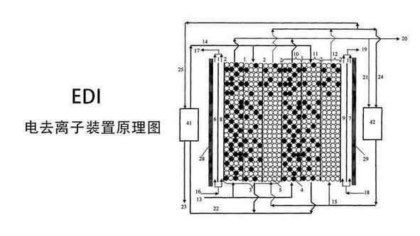 EDI進水中的陽離子和陰離子跟離子交換樹脂中的氫離子和氫氧根離子交換,形成超純水(高純水)。超極限電流使水電解產生的大量氫離子和氫氧根離子對離子交換樹脂進行連續的再生,可以連續工作,不需要酸堿化學再生。