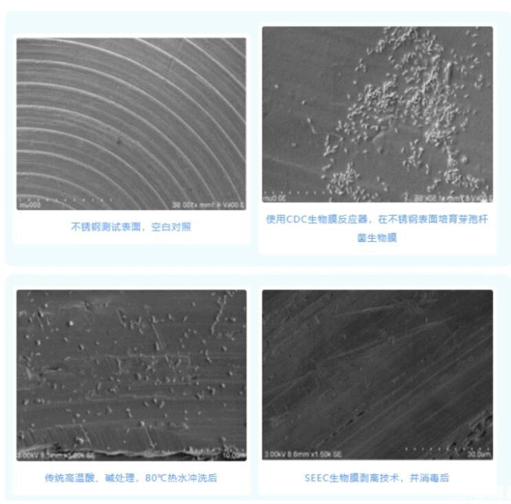 上圖可見,高溫或傳統強酸、強堿工藝處理生物膜,效果不理想。高溫、強酸或強堿無法有效清除已粘附于系統上的生物膜,且無法對生物膜下微生物進行有效殺滅。因傳統方法清除生物膜效果不理想,研究表明,過氧化氫在控制生物膜方面要比氯更有效,過氧化氫通過極強的氧化作用穿透細胞壁和生物被膜,破壞細菌的dna,從而杜絕生物膜的產生。