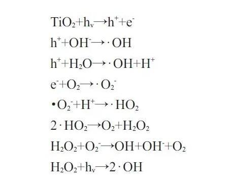 根據(jù)價帶理論,Ti O2為光催化劑,當(dāng)吸收大于其帶隙的光能時,電子從價帶激發(fā)到導(dǎo)帶,產(chǎn)生電子(e-)-空穴(h+)對,這些放電載體可以快速遷移到催化劑顆粒的表面,在那里它們最終被捕獲并且與合適的底物發(fā)生氧化還原反應(yīng)。反應(yīng)式如下: