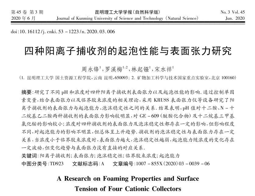 四種陽離子捕收劑的起泡性能與表面張力研究