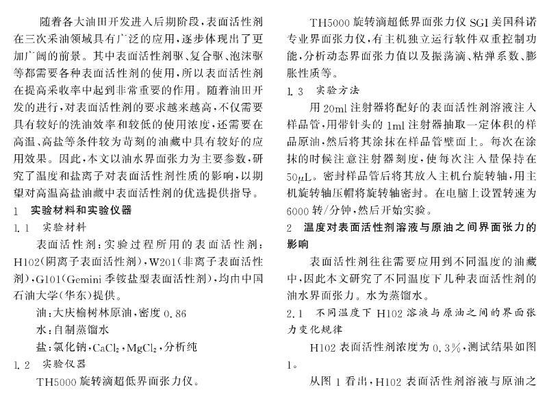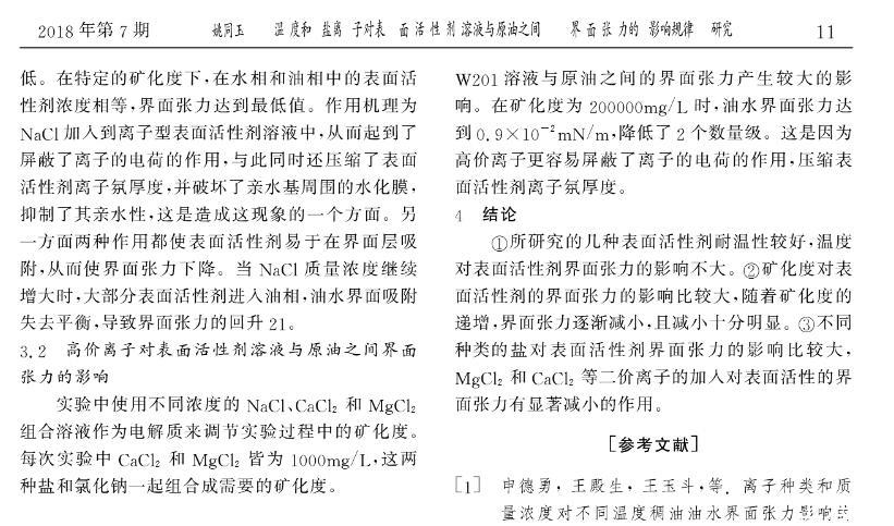 溫度和鹽離子對表面活性劑溶液與原油之間界面張力的影響規律研究