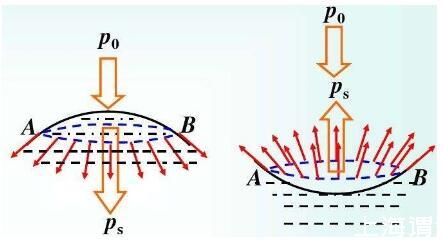 圖3、4中虛線圓周處的紅色小箭頭代表表面張力方向,p0代表大氣壓,ps代表表面張力合力,即:附加壓力。由圖3、4可以看出彎曲液面表面張力的合力(附加壓力)不為0,其方向均指向彎曲液面的曲率中心。