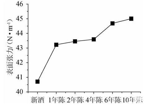 采用表面張力評價黃酒隨陳釀時間的變化,結果表明,黃酒的表面張力隨著陳釀時間整體呈上升趨勢,黃酒的表面張力與陳釀時間具有顯著的高度正相關關系。