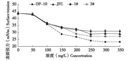 農(nóng)藥制劑噴霧使用時(shí),藥液的表面張力會(huì)影響到藥液在植物葉片上的潤濕性能和持留量,很多藥液難以在水稻、小麥和甘藍(lán)葉面濕潤展布,是由于藥液的表面張力大于這些植物的臨界表面張力,因此要選用能顯著降低表面張力的表面活性劑,或增加表面活性劑的用量,使藥劑推薦劑量藥液的表面張力值小于水稻的臨界表面張力值,才能有利于藥液在水稻等葉面上的濕潤。本研究中發(fā)現(xiàn),2.3%甲維鹽微乳劑在推薦使用倍數(shù)下,對(duì)應(yīng)藥液表面張力43.8 mN/m明顯高于水稻的臨界表面張力36-38 mN/cm,表現(xiàn)為藥液在葉片上難潤濕展布,因此本文通過添加4種助劑來降低藥液表面張力,當(dāng)藥液表面張力低于靶標(biāo)作物葉面表面張力時(shí),藥液才能在葉面潤濕展布,提高噴霧藥液的持留量和鋪展面積,綜合考慮,4種助劑表現(xiàn)最優(yōu)是乳化劑1#,其次是乳化劑2#,然后是JFC,OP-10表現(xiàn)最差。