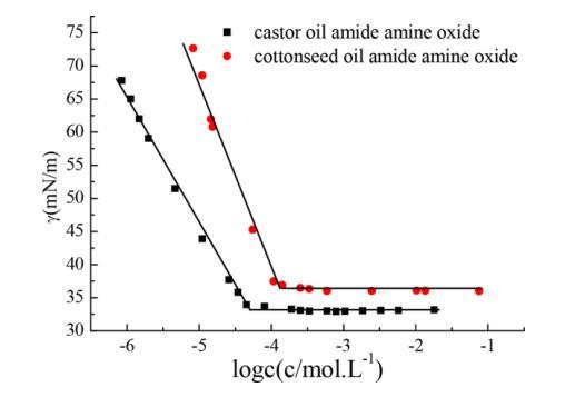 由表2可知,蓖麻油酰胺氧化胺和棉籽油酰胺 氧化胺將水的表面張力降低到最小值約 在 5.06×10-5 mol/L 的濃度下為 32.48 mN/m,在 5.06×10-5 mol/L 的濃度下為 36.53 1.23×10-4 mol/L,表明它們的表面活性很高。 和....相比 一些已報道的氧化胺表面活性劑,[12] 如十六烷基二甲基 氧化胺、十八烷基二甲基氧化胺和椰油酰胺丙基二甲基胺 氧化物等,其CMC值通常在10-4范圍內 ~10-3 mol/L, 這些 CMC 值較低。 這可能是因為幾種酰胺的混合物 氧化胺具有協同增強的作用,提高了表面 活動總體上。 還可以發現,蓖麻油的 CMC 和 γ(CMC) 值 酰胺氧化胺遠低于棉籽油酰胺氧化胺,后者 可能是由于蓖麻油酰胺氧化胺中存在-OH。 [13] 在 另外,從表 2 中的數據可以看出,蓖麻油的Γmax 值 酰胺氧化胺低于棉籽油酰胺氧化胺,而 前者的Amin值大于后者。 這一結果可能歸因于 烷基鏈的長度。 此外,ΔGmic 的負值表明 9 在 25 oC 時,膠束化是自發的,這意味著這兩種天然植物油 酰胺胺氧化物在空氣-水界面有極好的吸收能力 在溶液中形成膠束。