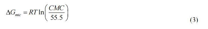 其中 R 是氣體常數,NA 是阿伏伽德羅數,T 是絕對溫度,并且 n 是溶質種類的數量,我們可以將其設置為 1。 膠束化的自由能 (ΔGmic) 由等式 (3) 計算。