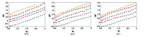 在lgc=-3.00時,可看出較完整的動態(tài)表面張力降低曲線,開始時表面張力接近溶劑的表面張力,隨時間的延長表面張力先快速下降,降至一定數(shù)值后,降幅趨緩,在一段時間內(nèi)基本保持不變。因為氣/液界面新生成時,GSS362尚未在表面吸附,界面張力為溶劑的表面張力,隨著時間的延長,表面活性劑分子開始在表面吸附,氣/液界面張力降低,隨著吸附的進(jìn)行,表面逐步趨于飽和,表面活性劑分子在表面吸附的速率下降,因而動態(tài)表面張力下降速率變慢,趨于平衡。